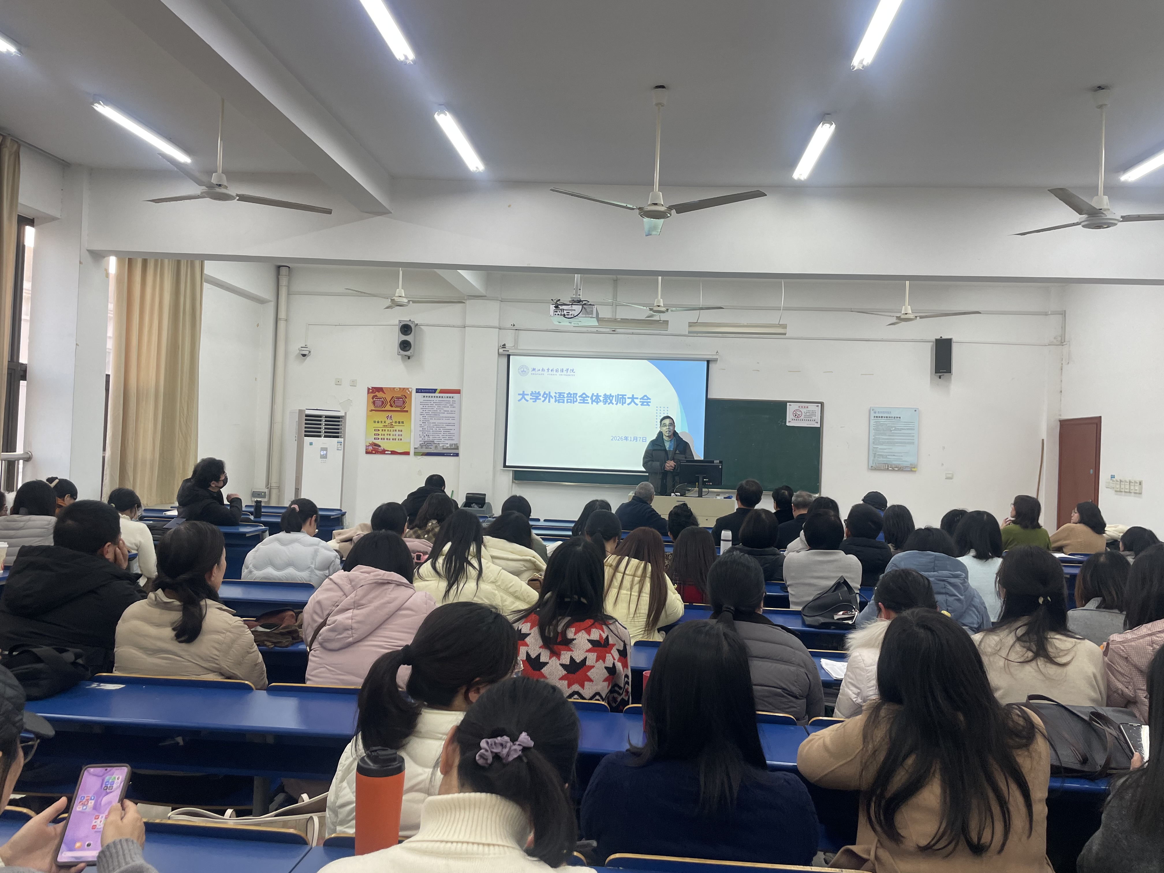 2026年1月7日下午,大学外语部召开本学期期末全体教师大会。会议系统回顾了过去一学期的各项工作,展望新学期发展愿景,并就期末阶段重点任务作出部署。大学外语部全体教职工参加会议。
